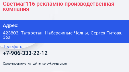 Светмаг116, рекламно-производственная компания по адресу 423803, Татарстан, Набережные Челны, Сергея Титова, 36а в дальнейшем Организация, размещена в следующих категориях: