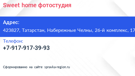 Sweet home, фотостудия по адресу 423827, Татарстан, Набережные Челны, 26-й комплекс, 17 в дальнейшем Организация, размещена в следующих категориях:
