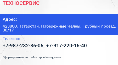 ТЕХНОСЕРВИС по адресу 423800, Татарстан, Набережные Челны, Трубный проезд, 38/17 в дальнейшем Организация, размещена в следующих категориях: