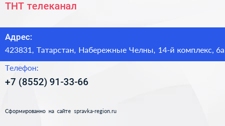 ТНТ, телеканал по адресу 423831, Татарстан, Набережные Челны, 14-й комплекс, 6а в дальнейшем Организация, размещена в следующих категориях:
