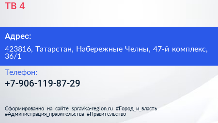 ТВ-4 по адресу 423816, Татарстан, Набережные Челны, 47-й комплекс, 36/1 в дальнейшем Организация, размещена в следующих категориях: