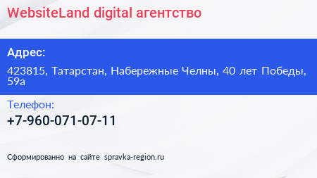 WebsiteLand digital, агентство по адресу 423815, Татарстан, Набережные Челны, 40 лет Победы, 59а в дальнейшем Организация, размещена в следующих категориях: