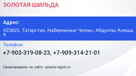 ЗОЛОТАЯ ШИЛЬДА по адресу 423825, Татарстан, Набережные Челны, Абдуллы Алиша, 9 в дальнейшем Организация, размещена в следующих категориях: