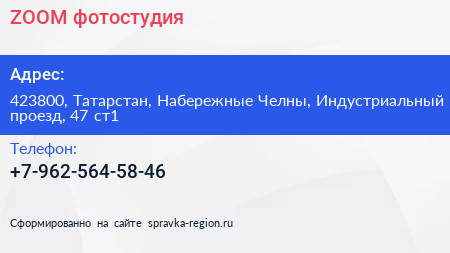 ZOOM, фотостудия по адресу 423800, Татарстан, Набережные Челны, Индустриальный проезд, 47 ст1 в дальнейшем Организация, размещена в следующих категориях: