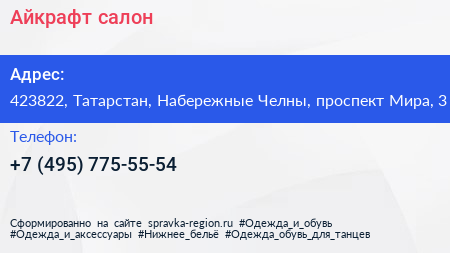 Айкрафт, салон по адресу 423822, Татарстан, Набережные Челны, проспект Мира, 3 в дальнейшем Организация, размещена в следующих категориях: