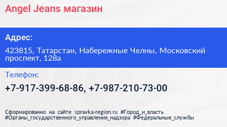 Angel Jeans, магазин по адресу 423815, Татарстан, Набережные Челны, Московский проспект, 128а в дальнейшем Организация, размещена в следующих категориях: