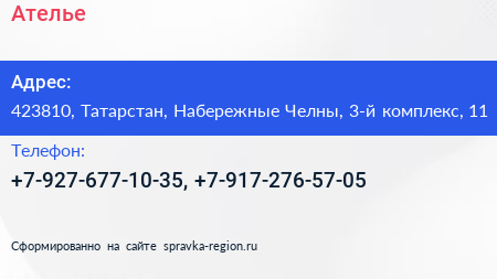 Ателье по адресу 423810, Татарстан, Набережные Челны, 3-й комплекс, 11 в дальнейшем Организация, размещена в следующих категориях: