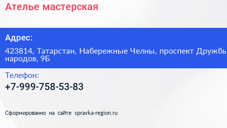 Ателье-мастерская по адресу 423814, Татарстан, Набережные Челны, проспект Дружбы народов, 9Б в дальнейшем Организация, размещена в следующих категориях: