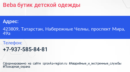 Beba, бутик детской одежды по адресу 423809, Татарстан, Набережные Челны, проспект Мира, 49а в дальнейшем Организация, размещена в следующих категориях:
