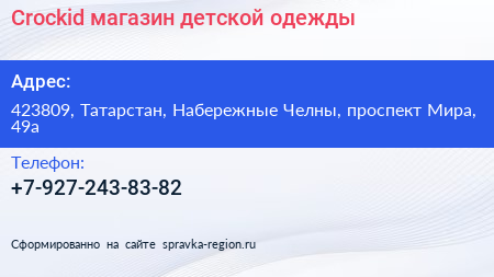 Crockid, магазин детской одежды по адресу 423809, Татарстан, Набережные Челны, проспект Мира, 49а в дальнейшем Организация, размещена в следующих категориях: