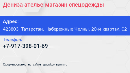 Дениза, ателье-магазин спецодежды по адресу 423803, Татарстан, Набережные Челны, 20-й квартал, 02 в дальнейшем Организация, размещена в следующих категориях: