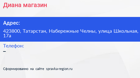 Диана, магазин по адресу 423800, Татарстан, Набережные Челны, улица Школьная, 17а в дальнейшем Организация, размещена в следующих категориях: