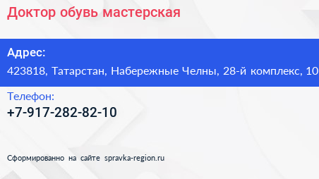 Доктор обувь, мастерская по адресу 423818, Татарстан, Набережные Челны, 28-й комплекс, 10 в дальнейшем Организация, размещена в следующих категориях: