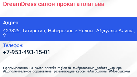 DreamDress, салон проката платьев по адресу 423825, Татарстан, Набережные Челны, Абдуллы Алиша, 9 в дальнейшем Организация, размещена в следующих категориях: