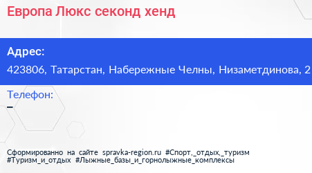 Европа Люкс, секонд-хенд по адресу 423806, Татарстан, Набережные Челны, Низаметдинова, 2 в дальнейшем Организация, размещена в следующих категориях: