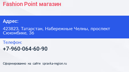 Fashion Point, магазин по адресу 423823, Татарстан, Набережные Челны, проспект Сююмбике, 36 в дальнейшем Организация, размещена в следующих категориях: