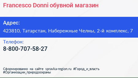 Francesco Donni, обувной магазин по адресу 423810, Татарстан, Набережные Челны, 2-й комплекс, 7 в дальнейшем Организация, размещена в следующих категориях: