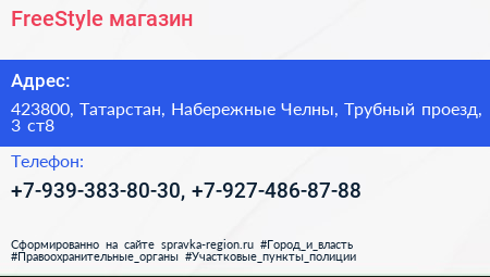 FreeStyle, магазин по адресу 423800, Татарстан, Набережные Челны, Трубный проезд, 3 ст8 в дальнейшем Организация, размещена в следующих категориях:
