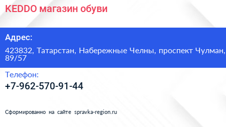 KEDDO, магазин обуви по адресу 423832, Татарстан, Набережные Челны, проспект Чулман, 89/57 в дальнейшем Организация, размещена в следующих категориях: