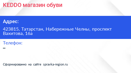KEDDO, магазин обуви по адресу 423815, Татарстан, Набережные Челны, проспект Вахитова, 16а в дальнейшем Организация, размещена в следующих категориях: