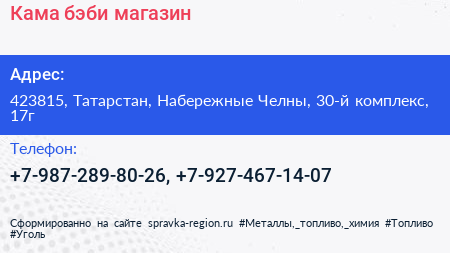 Кама бэби, магазин по адресу 423815, Татарстан, Набережные Челны, 30-й комплекс, 17г в дальнейшем Организация, размещена в следующих категориях: