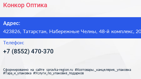 Конкор-Оптика по адресу 423826, Татарстан, Набережные Челны, 48-й комплекс, 20 в дальнейшем Организация, размещена в следующих категориях: