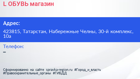 L`ОБУВЬ, магазин по адресу 423815, Татарстан, Набережные Челны, 30-й комплекс, 10а в дальнейшем Организация, размещена в следующих категориях: