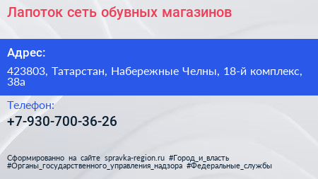 Лапоток, сеть обувных магазинов по адресу 423803, Татарстан, Набережные Челны, 18-й комплекс, 38а в дальнейшем Организация, размещена в следующих категориях: