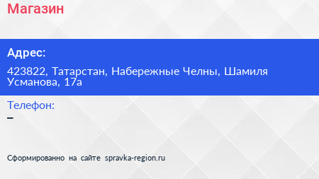 Магазин по адресу 423822, Татарстан, Набережные Челны, Шамиля Усманова, 17а в дальнейшем Организация, размещена в следующих категориях: