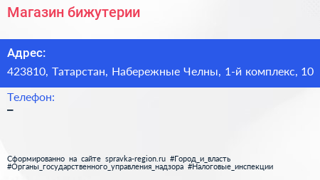 Магазин бижутерии по адресу 423810, Татарстан, Набережные Челны, 1-й комплекс, 10 в дальнейшем Организация, размещена в следующих категориях: