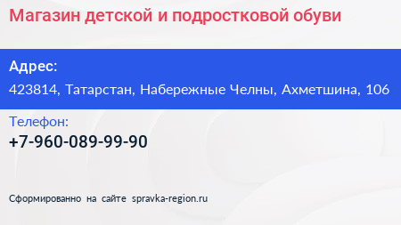 Магазин детской и подростковой обуви по адресу 423814, Татарстан, Набережные Челны, Ахметшина, 106 в дальнейшем Организация, размещена в следующих категориях:
