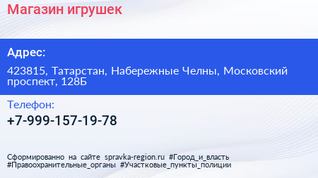 Магазин игрушек по адресу 423815, Татарстан, Набережные Челны, Московский проспект, 128Б в дальнейшем Организация, размещена в следующих категориях: