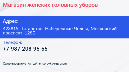 Магазин женских головных уборов по адресу 423815, Татарстан, Набережные Челны, Московский проспект, 128Б в дальнейшем Организация, размещена в следующих категориях: