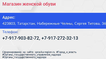Магазин женской обуви по адресу 423803, Татарстан, Набережные Челны, Сергея Титова, 36 в дальнейшем Организация, размещена в следующих категориях:
