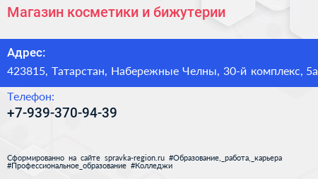 Магазин косметики и бижутерии по адресу 423815, Татарстан, Набережные Челны, 30-й комплекс, 5а в дальнейшем Организация, размещена в следующих категориях: