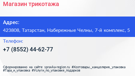 Магазин трикотажа по адресу 423808, Татарстан, Набережные Челны, 7-й комплекс, 5 в дальнейшем Организация, размещена в следующих категориях: