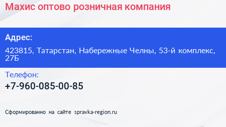 Махис, оптово-розничная компания по адресу 423815, Татарстан, Набережные Челны, 53-й комплекс, 27Б в дальнейшем Организация, размещена в следующих категориях: