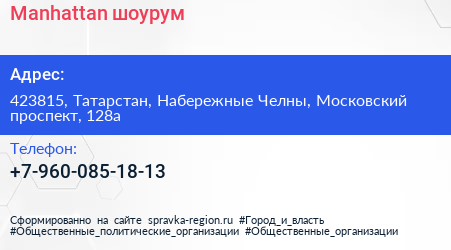 Manhattan, шоурум по адресу 423815, Татарстан, Набережные Челны, Московский проспект, 128а в дальнейшем Организация, размещена в следующих категориях: