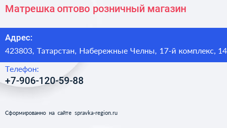 Матрешка, оптово-розничный магазин по адресу 423803, Татарстан, Набережные Челны, 17-й комплекс, 14 в дальнейшем Организация, размещена в следующих категориях: