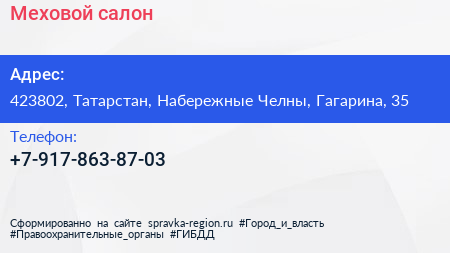 Меховой салон по адресу 423802, Татарстан, Набережные Челны, Гагарина, 35 в дальнейшем Организация, размещена в следующих категориях: