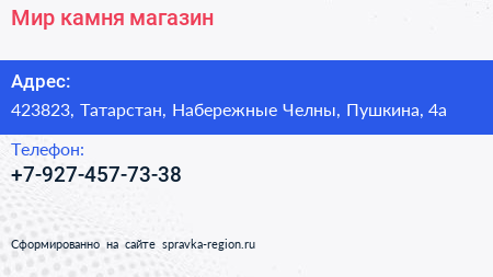 Мир камня, магазин по адресу 423823, Татарстан, Набережные Челны, Пушкина, 4а в дальнейшем Организация, размещена в следующих категориях: