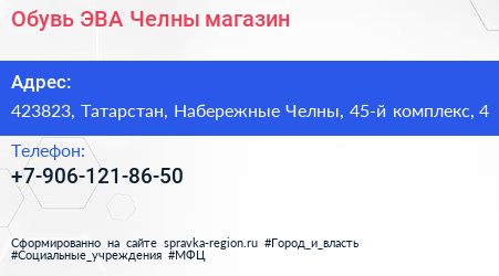 Обувь ЭВА Челны, магазин по адресу 423823, Татарстан, Набережные Челны, 45-й комплекс, 4 в дальнейшем Организация, размещена в следующих категориях: