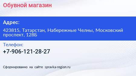 Обувной магазин по адресу 423815, Татарстан, Набережные Челны, Московский проспект, 128Б в дальнейшем Организация, размещена в следующих категориях: