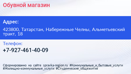 Обувной магазин по адресу 423800, Татарстан, Набережные Челны, Альметьевский тракт, 18 в дальнейшем Организация, размещена в следующих категориях: