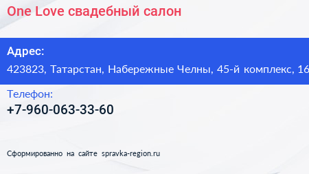 One Love, свадебный салон по адресу 423823, Татарстан, Набережные Челны, 45-й комплекс, 16 в дальнейшем Организация, размещена в следующих категориях: