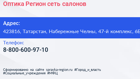 Оптика Регион, сеть салонов по адресу 423816, Татарстан, Набережные Челны, 47-й комплекс, 6Б в дальнейшем Организация, размещена в следующих категориях: