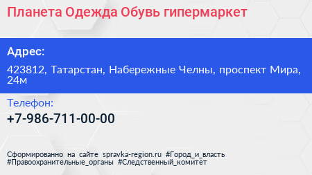 Планета Одежда Обувь, гипермаркет по адресу 423812, Татарстан, Набережные Челны, проспект Мира, 24м в дальнейшем Организация, размещена в следующих категориях: