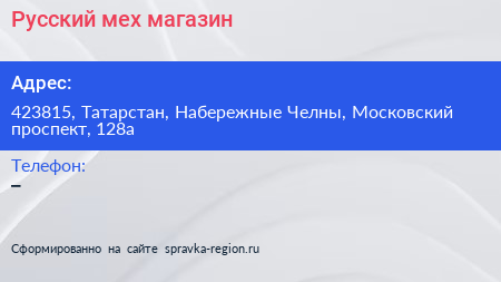 Русский мех, магазин по адресу 423815, Татарстан, Набережные Челны, Московский проспект, 128а в дальнейшем Организация, размещена в следующих категориях: