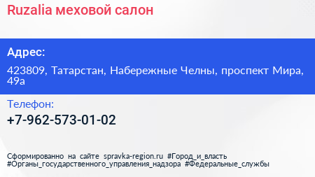 Ruzalia, меховой салон по адресу 423809, Татарстан, Набережные Челны, проспект Мира, 49а в дальнейшем Организация, размещена в следующих категориях: