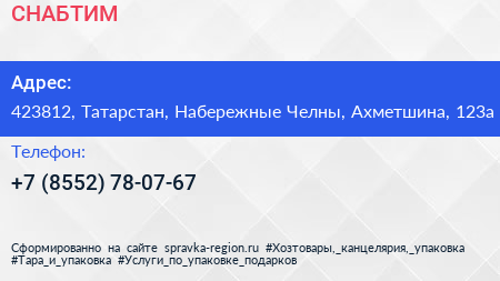 СНАБТИМ по адресу 423812, Татарстан, Набережные Челны, Ахметшина, 123а в дальнейшем Организация, размещена в следующих категориях: